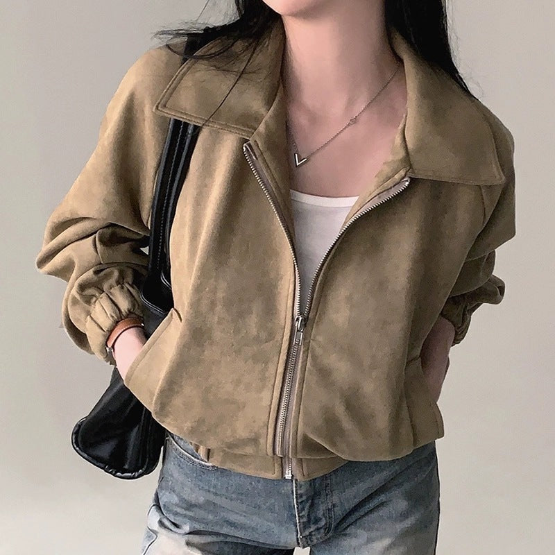 Lapel Zip-up Suede Feeling Loose With Long Sleeves Short